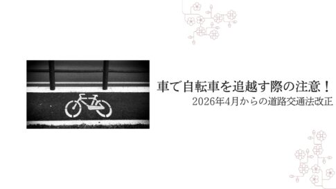 2026年4月からの道路交通法改正により、自転車に青切符が導入されることが話題となりましたが、この改正では「自動車側」の交通ルールについても変更点があります。 自転車の改正についてはこちら↓ 自動車側としては、自転車の右...