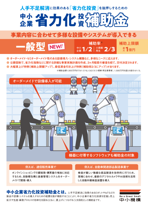 中小企業省力化投資補助金とは、独立行政法人中小企業基盤整備機構が行う公募の補助金です。
